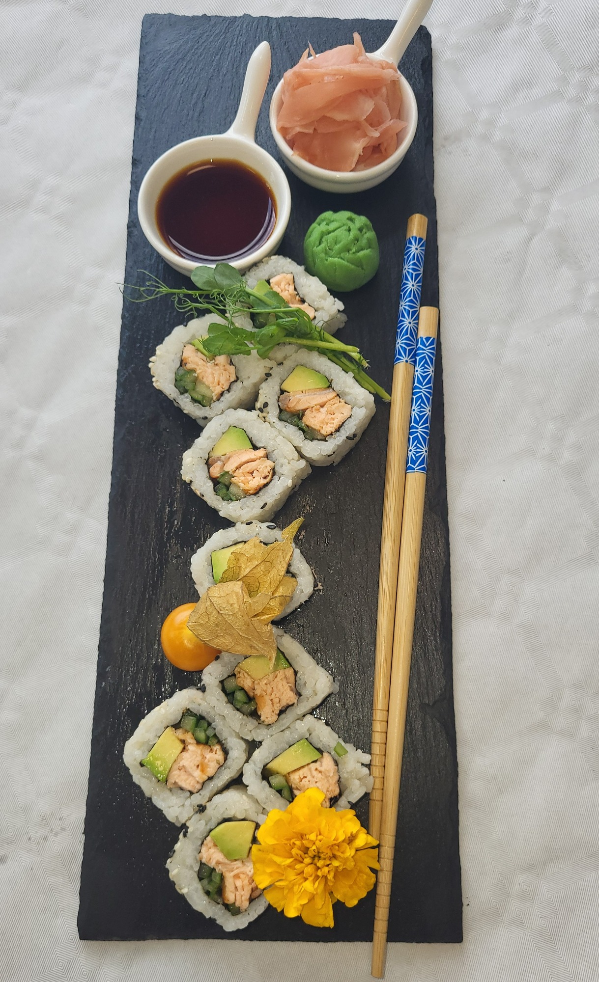• Uramaki Łosoś Mayumi (8 szt.) – wyjątkowe połączenie łososia i autorskiego sosu.